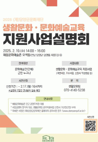 이번 설명회는 2025 담양군문화재단 생활문화·문화예술교육지원 사업에 대한 안내와 주요개편사항, 지원항목, 신청 절차 등을 설명할 예정이며, 재단 홈페이지신청 링크를 통해 오는 17일 오후 4시까지 사전 접수 가능하다.