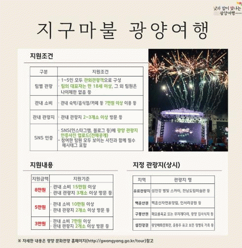 광양시는 관광지 방문 및 SNS 인증 등 필수조건을 수행하면, 광양에서 7만 원, 10만 원, 15만 원 이상 소비한 관광객에게 최대 8만 원까지 인센티브를 지원한다.