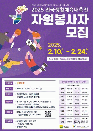 지원 자격은 만 18세 이상으로 활동에 제약이 없는 개인과 단체 누구나 가능하며, ‘2025 전국생활체육대축전 자원봉사 플랫폼’ 또는 고흥군자원봉사센터(고흥군청 주민복지과)를 방문해 신청할 수 있다.