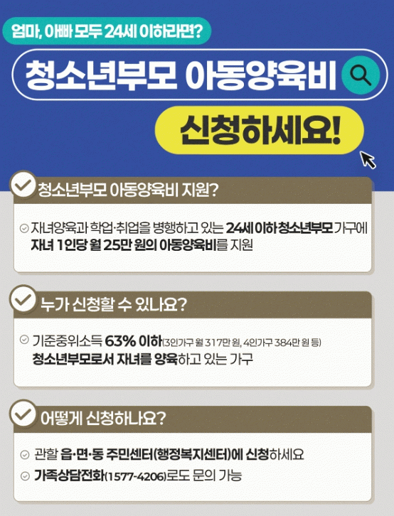 자녀양육과 학업·취업을 병행하는 청소년부모 가구에 자녀 1인당 월 25만 원을 지원하며, 기준중위소득 63% 이하(3인 가구 월 317만 원·4인 가구 384만 원 등)인 청소년부모로 자녀를 양육하는 가구라면 신청할 수 있다.