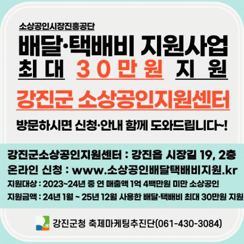 많은 강진군 소상공인이 지원받을 수 있도록 강진군 소상공인지원센터(강진읍 시장길 19, 2층)가 강진군 소상공인이라면 방문 시 사업 안내 및 온라인 신청을 함께 진행하는 서비스를 제공한다.