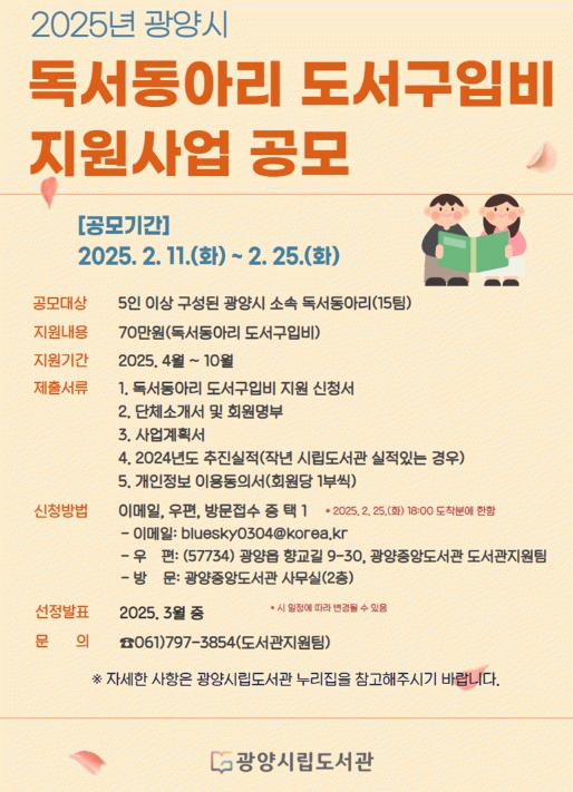 기타 자세한 사항은 광양시 도서관과 도서관지원팀으로 문의하면 된다.