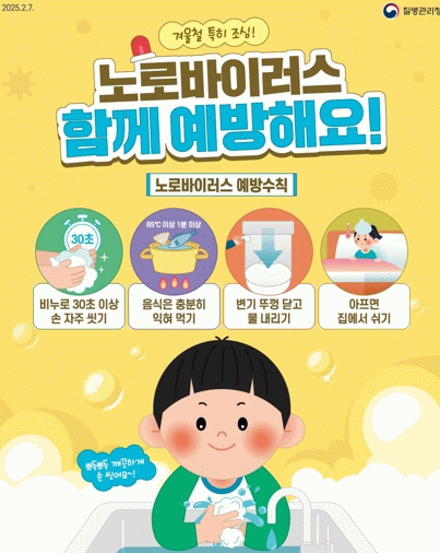 노로바이러스는 늦가을부터 이듬해 초봄까지 영유아를 중심으로 유행하며, 오염된 음식물 · 물을 섭취하거나, 환자 접촉이 주된 감염원으로 밝혀졌다.