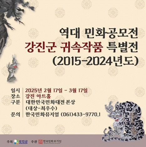 강진군 주최 한국민화뮤지엄 주관으로 진행되는 이번 특별전은 역대 대한민국민화대전의 본상 수상작으로 강진군에 귀속된 작품 중에서도 엄선된 작품을 한 자리에서 만나볼 수 있다.