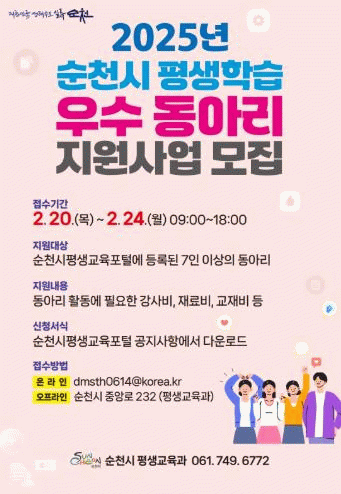 신청 대상은 공고일 기준 순천시 평생교육 포털에 등록된 학습 동아리이다.