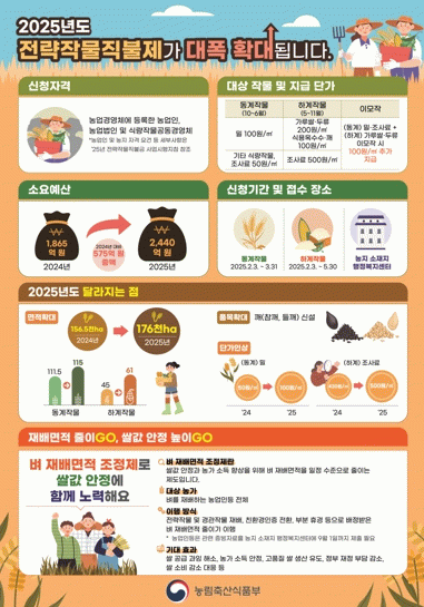 전략작물직불제는 논(1,000㎡ 이상)에서 벼 대신 전략 작물을 단작 또는 이모작 하는 농업인에게 국비 100%로 품목별 직불금을 지급하는 사업이다.