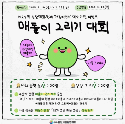 이명만 협의회장은 “제24회 광양매화축제장에 광양의 대표성과 상징성을 담은 인기 캐릭터 ‘매돌이’를 활용한 ‘매돌이랜드’ 체험존 운영을 앞두고 매돌이 그리기 이벤트를 개최한다.”면서 “상상력과 창의력 넘치는 많은 분들의 참여와 참신한 작품을 기대한다”고 말했다.
