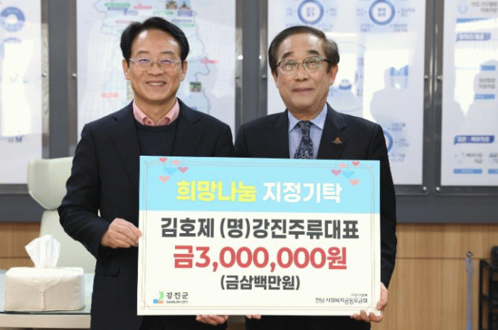 지난 18일 강진군청에서 열린 희망나눔 지정기탁식에서 (명)강진주류 김호제 대표와 태영사(주지 도우) 신도회가 어려운 이웃을 위해 뜻깊은 기부를 실천했다.