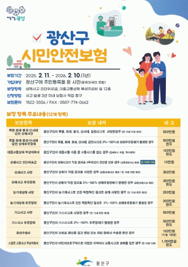 박병규 광산구청장은 “보장 항목 조정을 통해 더 많은 시민이 일상 속 안전을 보호받을 수 있을 것”이라며 “앞으로 시민들의 생활 안전을 위해 지속적으로 제도를 운영하고 개선하겠다”고 전했다.