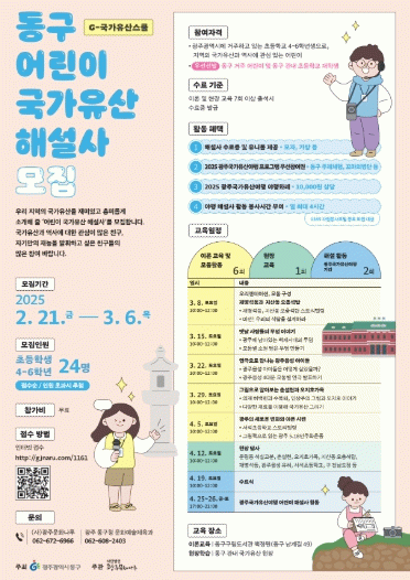 교육 일정은 지역의 국가 유산과 역사를 알아보는 ▲이론 교육 ▲현장 교육 ▲해설 실습 등 총 9회에 걸쳐 진행된다. 수료한 어린이는 오는 4월 25~26일에 열리는 광주 국가 유산 야행 ‘돌의(義) 시간’에서 ‘동구 어린이 국가 유산 해설사’로 활동하게 된다.