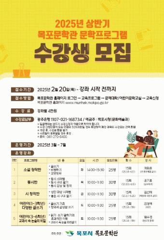 수강 신청은 오는 2월 20일부터 강좌 시작 전까지 목포문학관 홈페이지에서 선착순 접수하며 수강료는 강좌별 4만원이다.