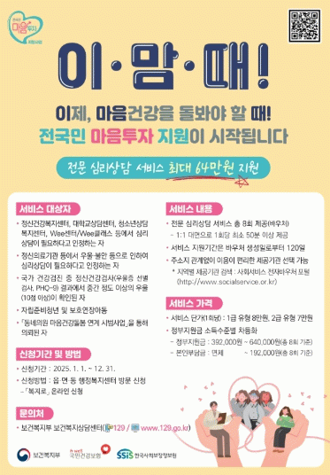 120일 동안 총 8회의 전문 심리상담을 받을 수 있는 바우처를 제공하며, 소득수준에 따라 본인부담금(0~30%)이 차등 적용된다.