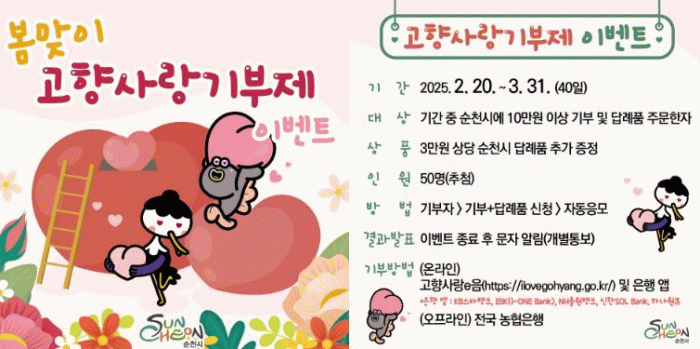 시 관계자는 “봄을 맞아 고향사랑기부제에 대한 관심을 높이고 감사의 마음을 전하고자 이번 이벤트를 마련했다”며 “많은 분들의 관심과 참여를 부탁드린다”고 전했다.