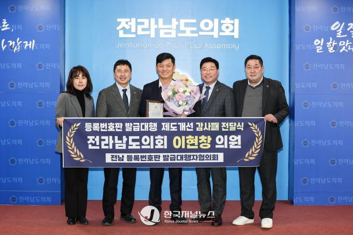 이번 감사패는 이 의원이 대표 발의한 「전라남도 자동차 등록번호판발급대행자 지정에 관한 조례 일부개정조례안」을 통해 자동차 등록번호판 발급대행자의 안정적 업무환경 조성에 기여한 공로를 높이 평가받은 결과다.
