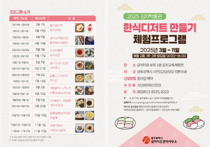 각 교육·체험 프로그램들은 온라인 사전예약제로 운영된다. 수강료와 일정 등 자세한 사항은 광주김치타운 누리집을 통해 확인할 수 있다. 광주시는 어려운 경제여건을 감안하고 시민의 부담을 줄이기 위해 대부분의 프로그램 수강료를 동결했다.