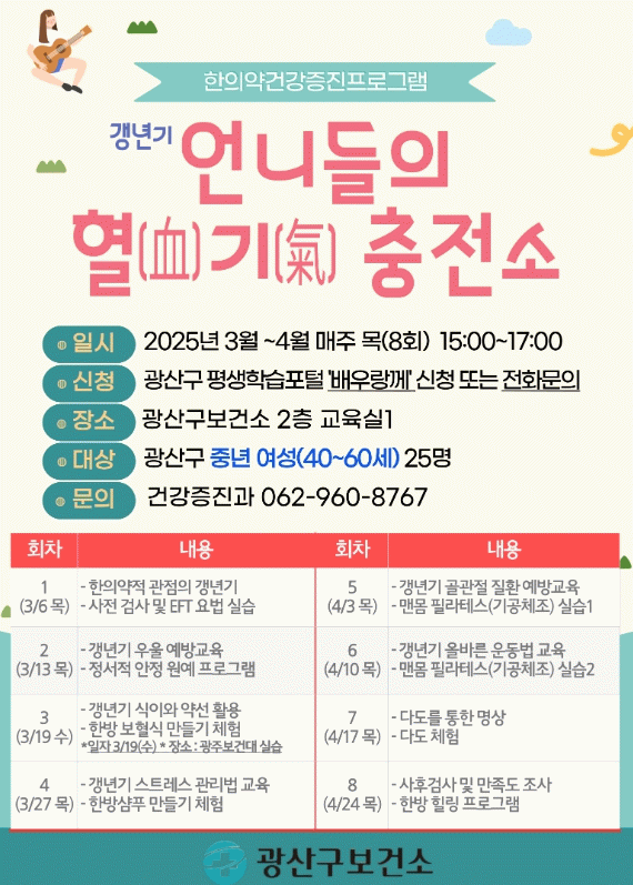 광산구 관계자는 “혈기충전소는 혈과 기운을 다스리는 한의약을 바탕으로 중요한 전환기인 갱년기를 슬기롭게 보내고, 건강을 지킬 수 있는 방법을 배우는 기회가 될 것”이라며 “갱년기 걱정 없는 건강한 생활 습관 형성에 관심 있는 시민의 관심과 참여를 바란다”고 말했다.