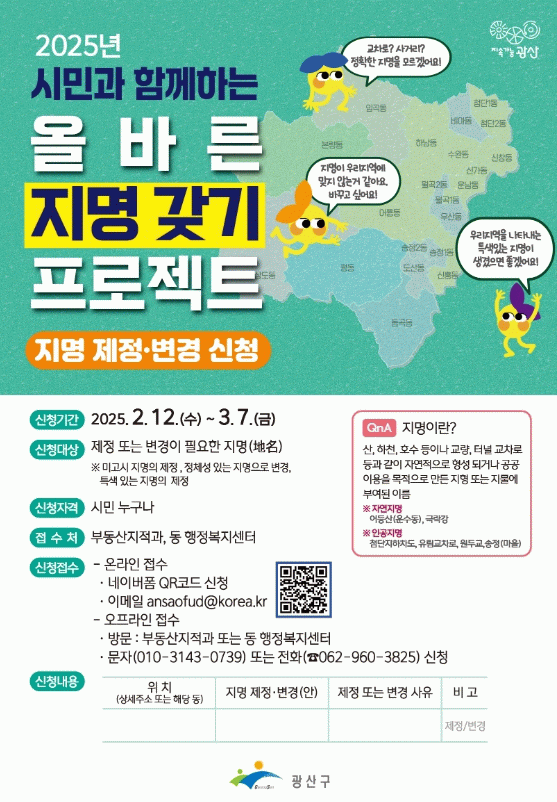 신청은 광산구 누리집 등에 게시한 웹자보 정보 무늬(QR코드)에 접속해 하거나 전자우편으로 제정 또는 변경했으면 하는 지명과 해당 지형‧시설물의 상세한 주소를 적어 제출하면 된다.