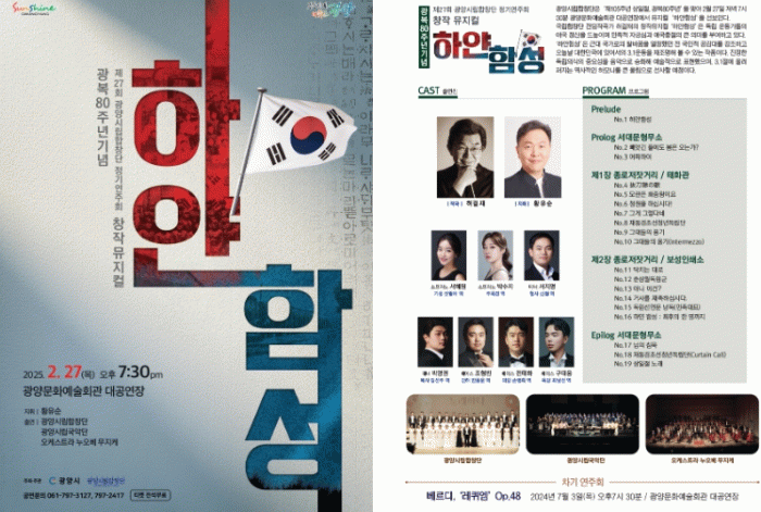 정인화 광양시장은 “이번 공연이 3・1절의 의미를 되새기는 뜻깊은 시간이 되기를 바란다”며 “많은 시민이 참석해 깊은 울림을 함께 나누길 기대한다”고 밝혔다.
