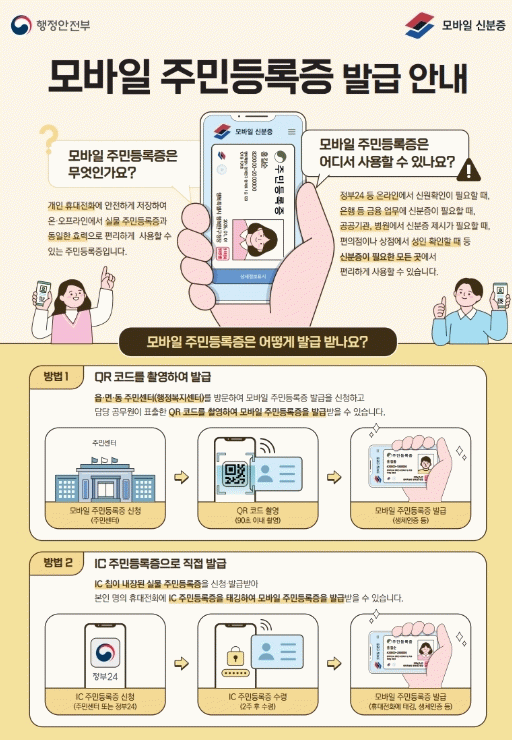 두 번째는 기존 실물 주민등록증을 이용하는 방식으로, 행정복지센터에서 발급용 QR 코드를 촬영하면 즉시 발급받을 수 있다. 단, 휴대전화를 교체하거나 앱을 삭제하면 재발급이 필요하다.