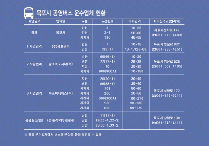 한편, 변경된 운행 시간 및 세부 노선 정보는 목포시청 누리집 방문 및 아래 전화번호로 문의하면 신속하게 안내받을 수 있다.