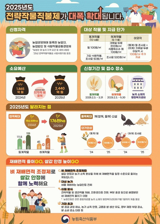 동계작물은 작년 가을 파종하여 ~ 봄에 수확하는 보리, 밀, 조사료 등이며 하계작물은 올해 봄에 파종하여 부터 가을에 수확하는 두류, 가루쌀, 하계 조사료 등이 대상으로, 품목에 따라 ha당 최대 500만원의 직불금을 지원한다.