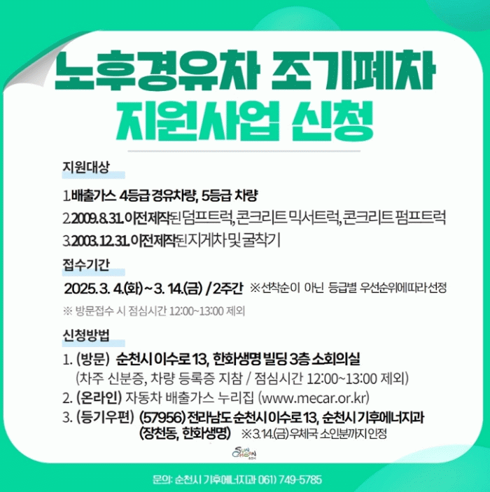 신청을 희망하는 차량 소유자는 오는 3월 4일부터 3월 14일까지 생태환경센터 3층 접수처 방문, 자동차배출가스 종합전산시스템, 등기우편 등으로 접수 가능하다.