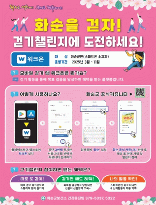 워크온은 걷기 활성화 모바일 앱으로 화순군민이면 누구나 참여할 수 있다.