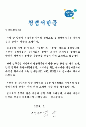 한편, 무안군은 2025년을 ‘청렴무안’ 구현의 원년으로 삼아 강력한 반부패 정책과 조직문화 혁신으로, 군민들이 체감하고 신뢰할 수 있는 청렴 문화를 조성해 나갈 계획이다.