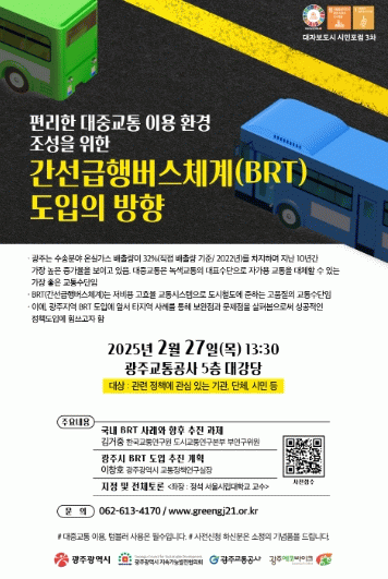 이날 포럼에서는 서울·세종·부산 등 국내 BRT 도입과 운영 사례를 살펴보고 전문가와 시민의 의견을 듣는다. 광주시는 포럼에서 제시된 정책적 제언을 광주시 교통정책 수립에 참고할 계획이다.