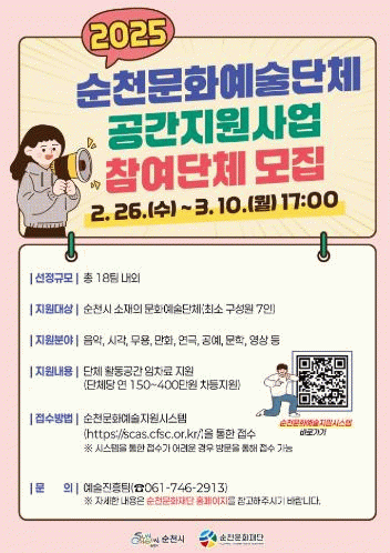 기타 자세한 사항은 순천문화재단 누리집 공고문에서 확인할 수 있으며 예술진흥팀으로 문의하면 된다.