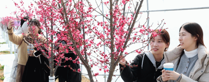 강진군이 지난해 축제 볼거리를 위해 심은 홍매화 200주가 최근 한파를 뚫고 봄 맞이를 위해 나선 나들이객들을 반기고 있는 것.