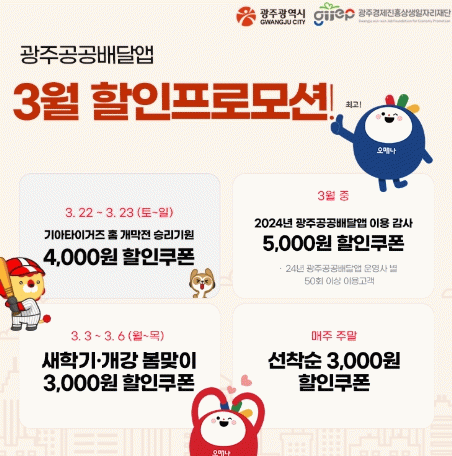 3월 특별할인 프로모션은 광주공공배달앱을 이용하고 있는 광주시민이면 누구나 참여할 수 있다. 공공배달앱 운영사인 ‘위메프오’와 ‘땡겨요’를 통해 할인쿠폰을 내려받을 수 있다.