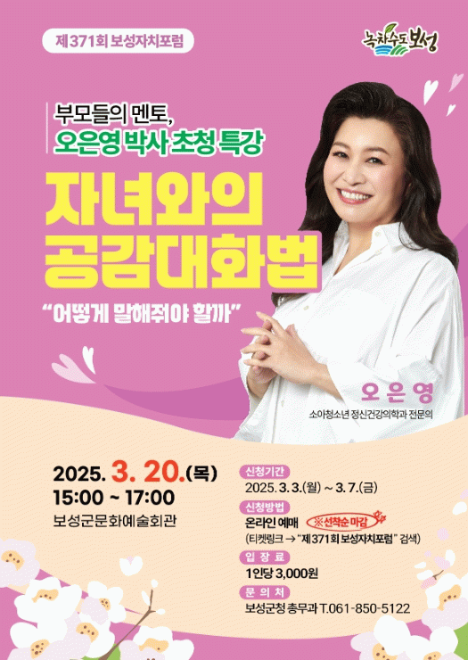 2025년도 첫 보성자치포럼 강연자로 초청된 오은영 박사는 MBC ‘오은영 리포트’, 채널A ‘요즘 육아 금쪽같은 내 새끼’ 등 다양한 방송 프로그램에서 활발히 활동 중이며, 부모 교육 및 심리 상담 분야에서 명성을 쌓아왔다.