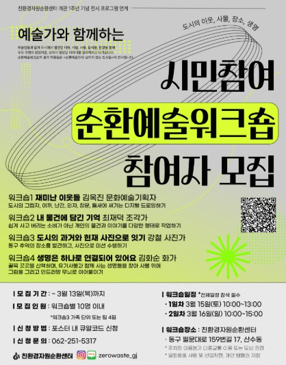 3월 15일부터 16일까지 이틀간 진행되는 이번 워크숍에는 김옥진 문화예술기획가, 최재덕 조각가, 강철 사진 예술가, 김화순 화가 등이 참여하며, 친환경자원순환센터와 인근 마을에서 진행된다.