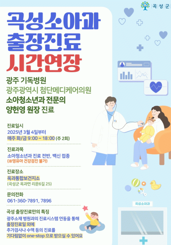 전남 곡성군은 3월 4일부터 옥과통합보건지소 소아청소년과 진료시간을 기존 9시~12시에서 9시~18시로 오후까지 연장하기로 했다.
