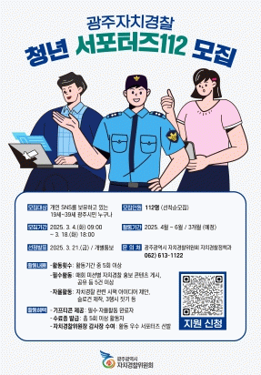 ‘청년 서포터즈 112’는 광주자치경찰위원회에서 지난 2021년 7월부터 전국 최초로 운영하는 것으로, 자치경찰위원회의 주요 시책 등을 SNS를 활용해 홍보하는 역할을 한다.