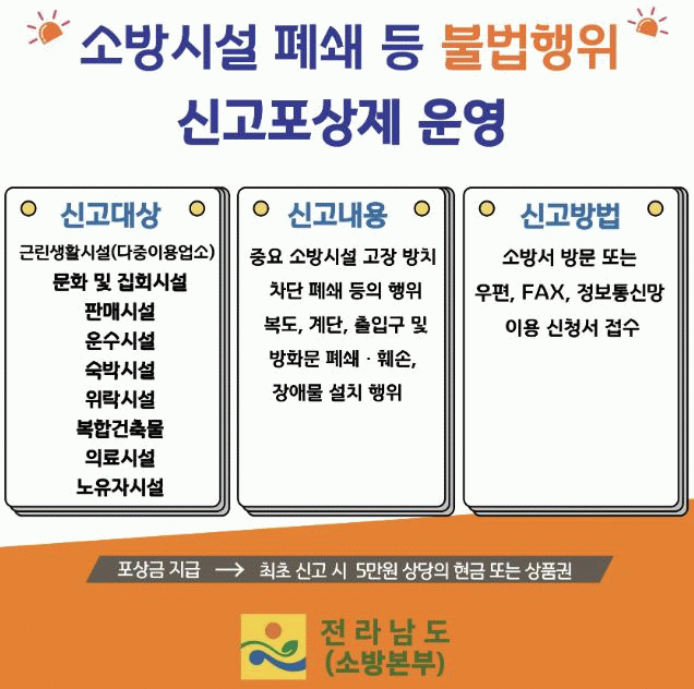 신고 방법 및 보상으로는 군민들이 위와 같은 불법행위를 발견할 경우, 장흥소방서에 신고하면 포상금을 지급받을 수 있다. 이를 통해 군민들은 소방시설 불법행위를 예방하고, 시설 운영자들에게 경각심을 일으킬 수 있는 중요한 역할을 하게 된다.