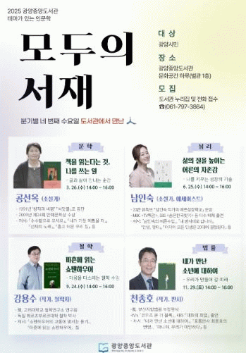 강연은 광양시민이라면 누구나 참여할 수 있고, 신청은 강연이 있는 달 4일 광양시립도서관 누리집(홈페이지) 또는 전화로 신청하면 된다.