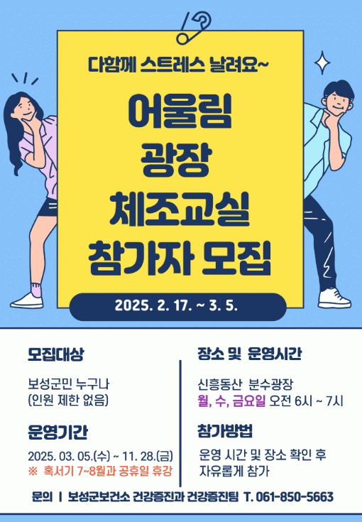 ▲신흥동산 분수광장 (월·수·금요일 오전 6시) ▲보성국민체육센터 (화·금요일 오후 2시) ▲벌교보건지소 (수·금요일 오전 10시 30분) ▲노동면 복지문화센터 (화요일 오후 6시 30분) ▲겸백면민회관 (화·금요일 오후 8시) ▲율어면 복지회관 (화·금요일 오후 1시) ▲복내면 친환경종합복지관 (화·금요일 오후 2시 30분) ▲문덕종합생활관 (월·수요일 오후 7시 30분) ▲동로현 복지센터 (수·금요일 오후 1시 30분) ▲득량국민체육센터 (화·목요일 오후 2시) ▲회천면 복지회관 (월·화요일 오후 7시)