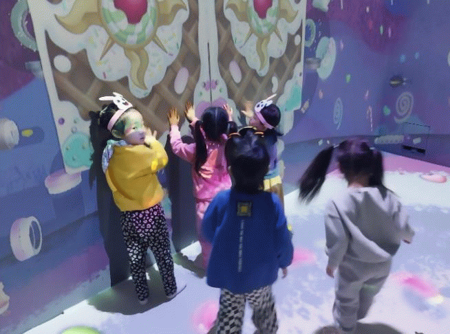 아이들은 동화구연 선생님의 지도로 온몸을 활용하여 벽과 바닥을 터치하고, VR기술과 상호작용하여 생동감 있는 경험을 할 수 있다.