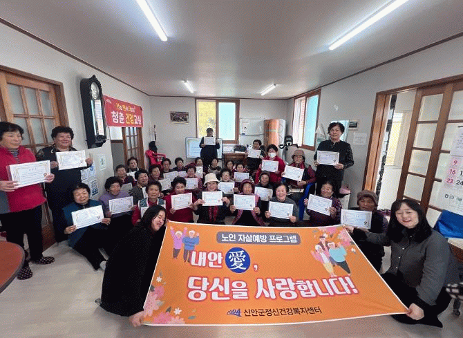 ‘내안애(愛)’ 프로그램은 ‘내가 안아주고 사랑할게‘라는 노인 자살예방 프로그램을 압해읍 4개 마을 100명의 65세 이상 노인 대상으로 정신건강 실태조사 및 자살 문제 예방하고자 경로당별 5회기 소규모 집중교육 프로그램을 진행하여 어르신들의 높은 호응을 받았다.