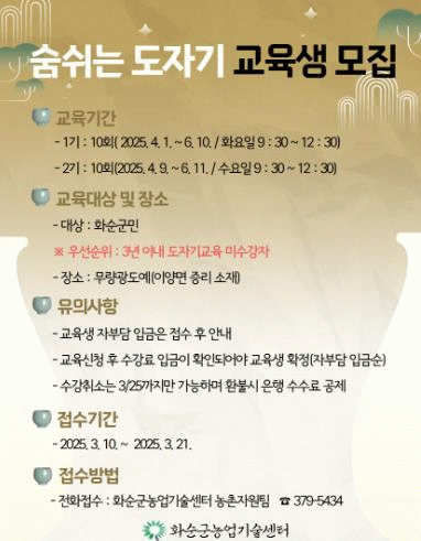 화순군농업기술센터 류창수 소장은 “전통 생활 문화 자원인 도예를 활용한 이번 교육을 통해 선조들의 장인정신을 배우는 동시에 부가 소득 창출 기회가 될 것으로 기대한다”라며, “도예 교육에 많은 관심과 참여를 당부한다”라고 말했다.