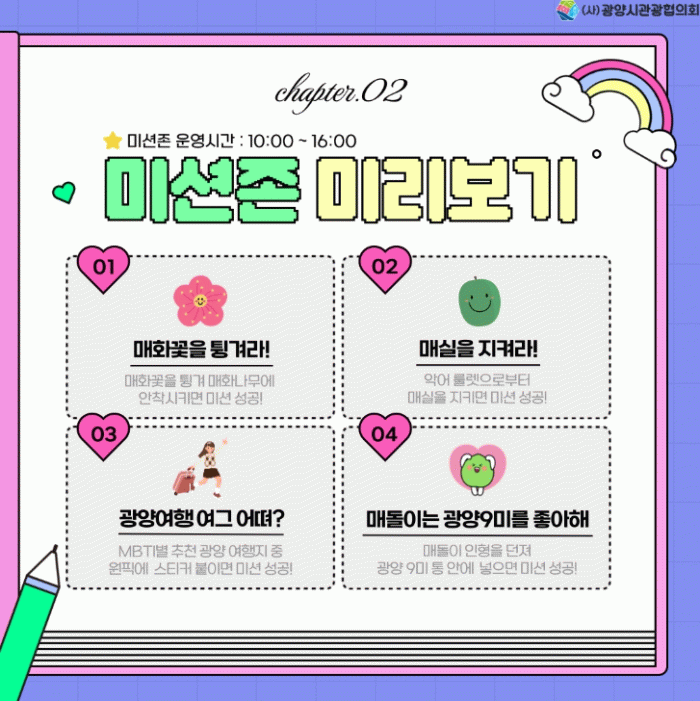 미션존에는 △매화꽃을 튕겨라 △매실을 지켜라 △광양여행여그어뗘? △매돌이는 광양 9미를 좋아해 등의 프로그램이 마련됐으며, 축제 전 기간 매일 오후 4시까지 운영된다.