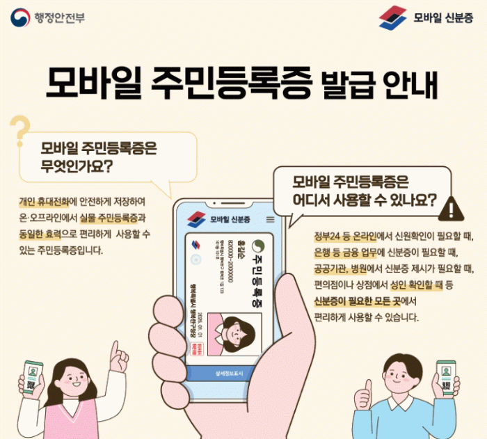 모바일 주민등록증은 실물 주민등록증과 동일한 효력으로 공공기관, 금융기관, 편의점, 병원 등 다양한 곳에서 사용할 수 있다.