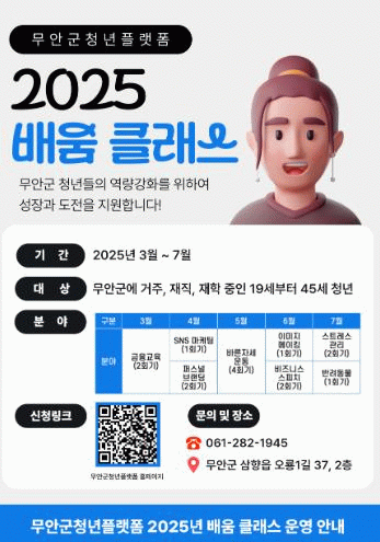 공간 지원 사업과 배움 클래스는 무안군 청년이라면 누구나 신청할 수 있으며, 자세한 사항은 무안군청년플랫폼 홈페이지를 통해 확인할 수 있다.