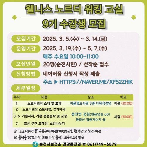 노르딕 워킹·맨발걷기 교실은 순천 시민 누구나 참여할 수 있으며 수강생 40명을 선착순으로 모집한다.
