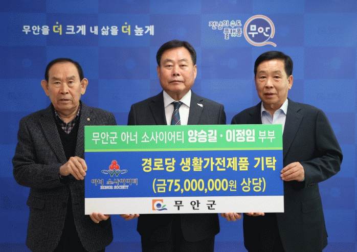 이날 기탁된 생활가전제품(양문형 냉장고 및 김치냉장고)는 대한노인회 무안군지회를 통해 관내 경로당 56개소에 전달될 예정이다.