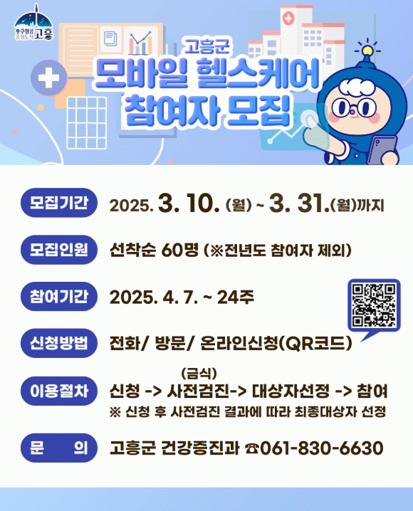 사업 참여를 희망하는 군민은 고흥군 보건소 건강증진과로 문의하면 된다.