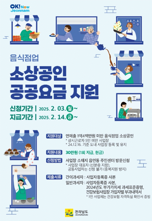 지원 대상자는 2024년 12월 16일 현재 전남에 사업장을 등록하고 신청 기간까지 사업을 유지 중인 음식점업 소상공인으로 상시근로자 5인 미만, 연매출액은 1억 400만 원을 넘지 않아야 한다.