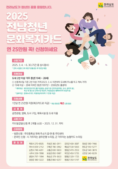 지원 대상은 2023년 3월 4일 이전부터 전라남도에 주소를 두고 계속 거주하고 있는 19세 이상 28세 이하(1997 부터 2006년 출생) 청년이며 1인당 연 25만원의 문화복지비를 지원한다.